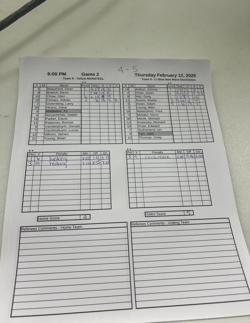 | 76 | 2025-Dec-4 | 4 | 5 New Wave Electronics | 3 Wasaga Beach Brewing Co. | 3 - 4 | OT |