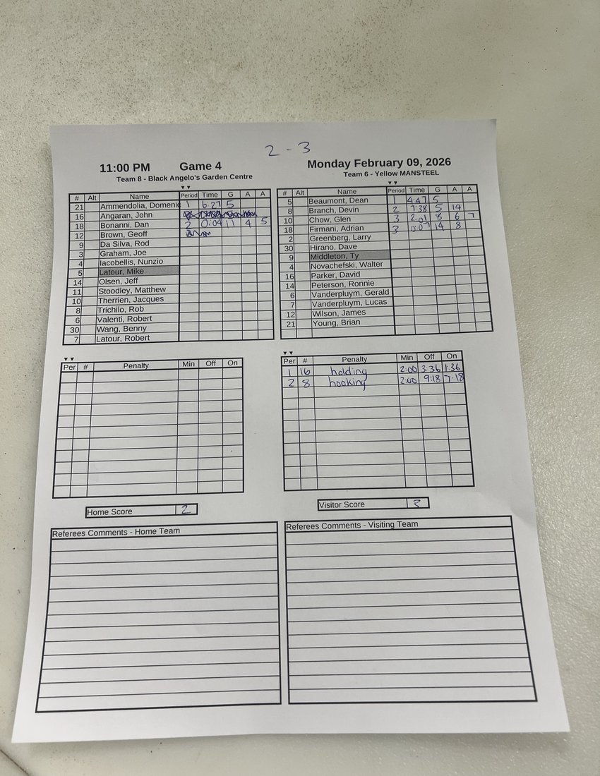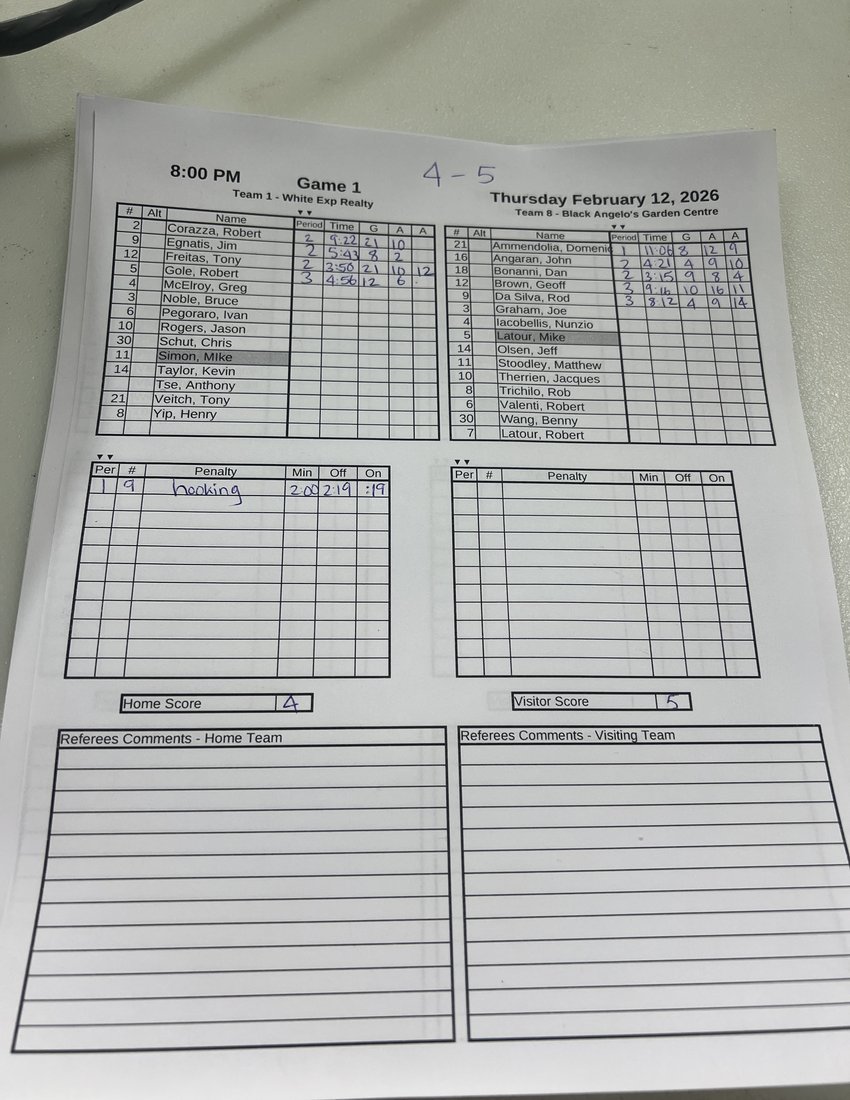 | 133 | 2026-Feb-12 | 1 | 8 Angelo's Garden Centre | 1 Exp Realty | 5 - 4 | |