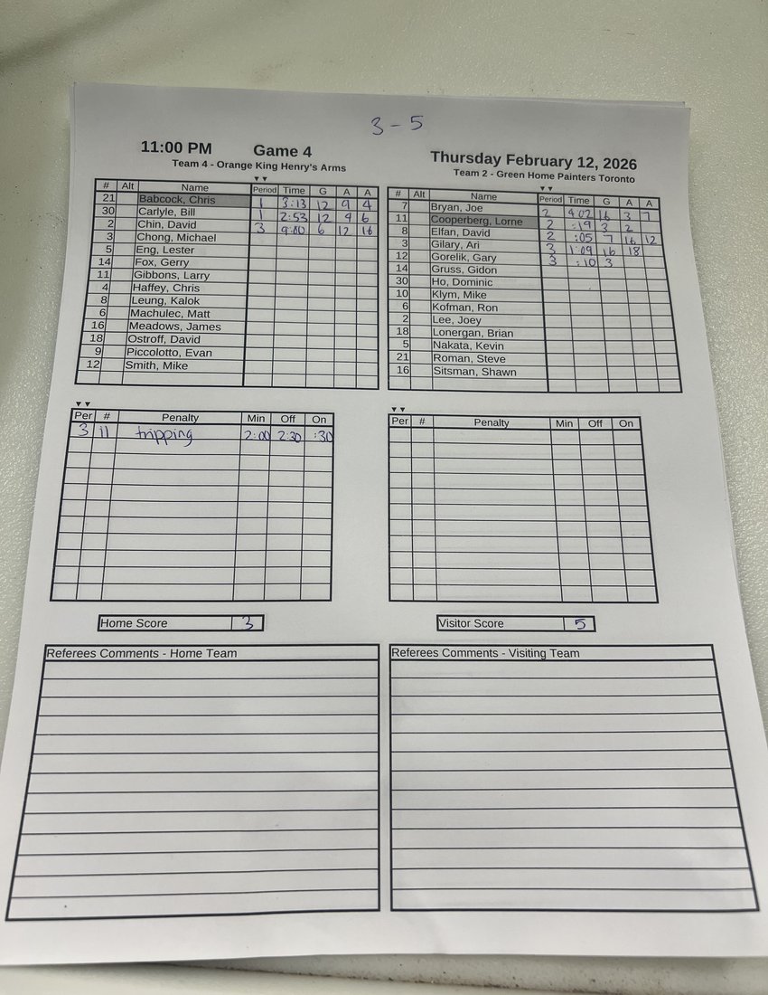 | 136 | 2026-Feb-12 | 4 | 2 Home Painters Toronto | 4 King Henry's Arms | 5 - 3 | |