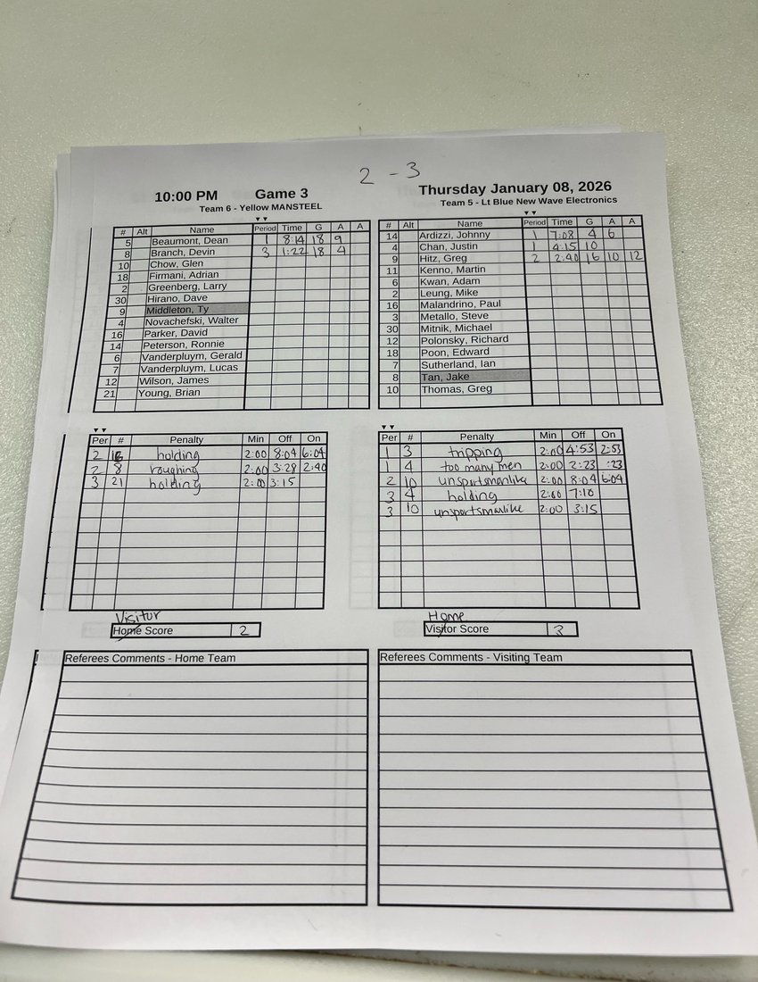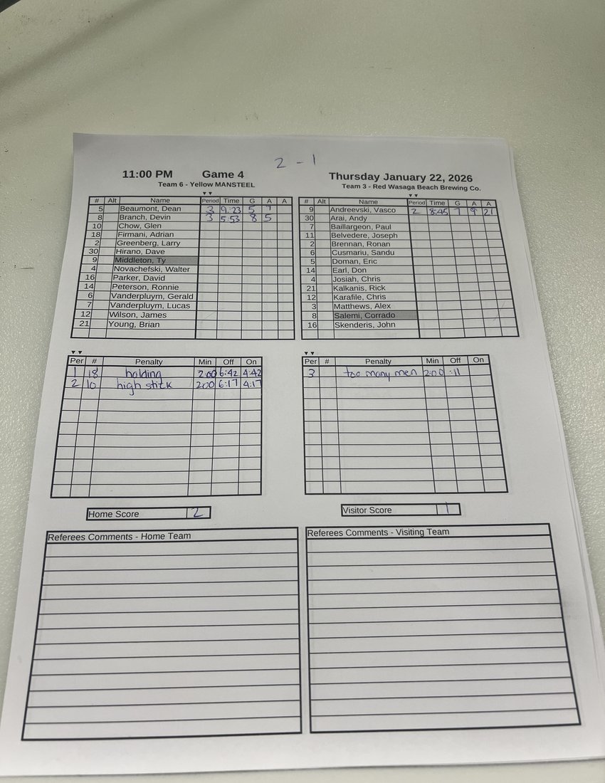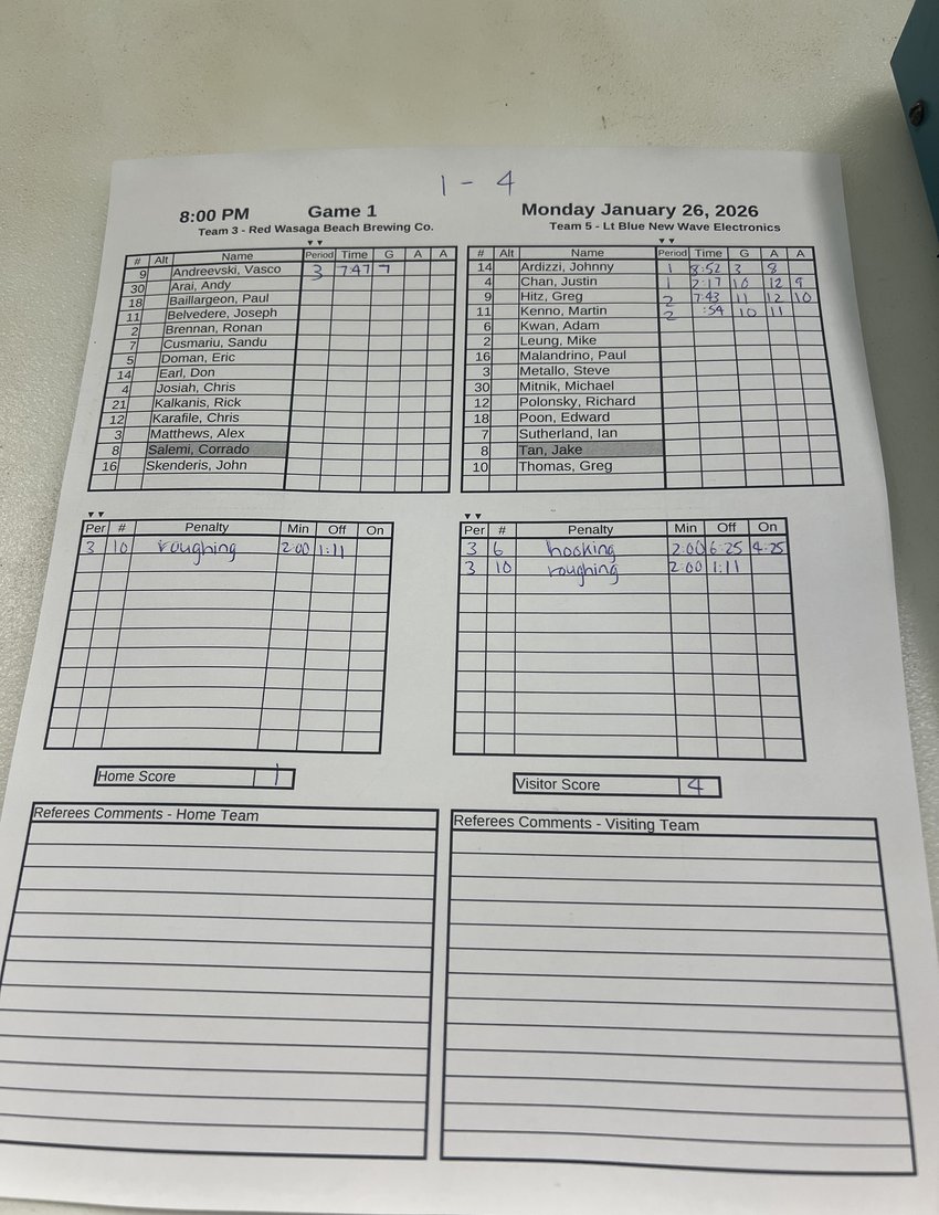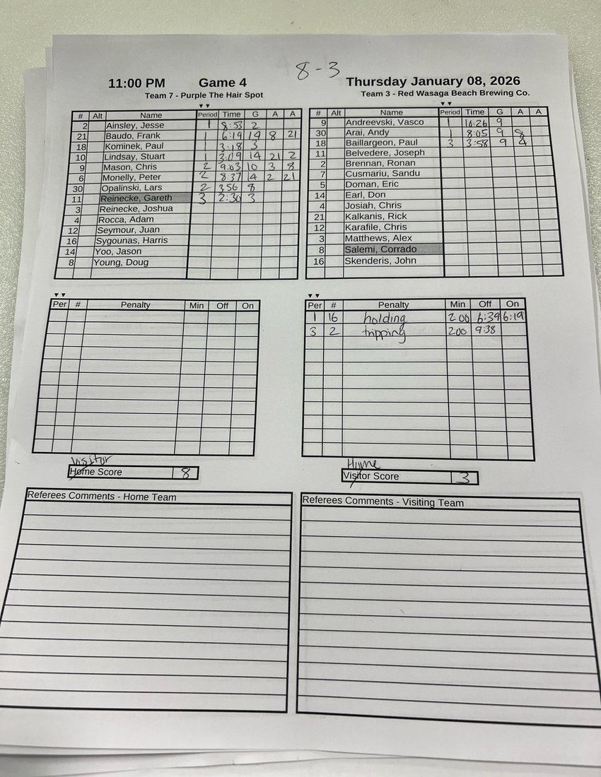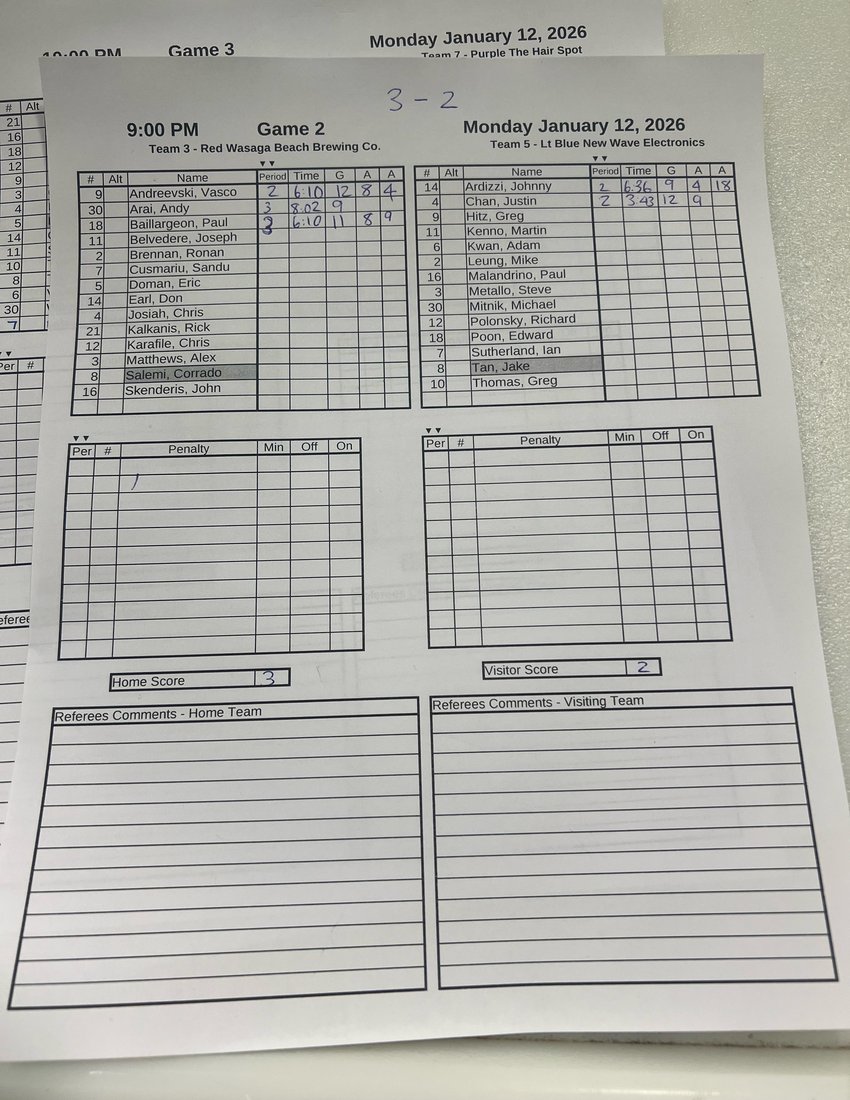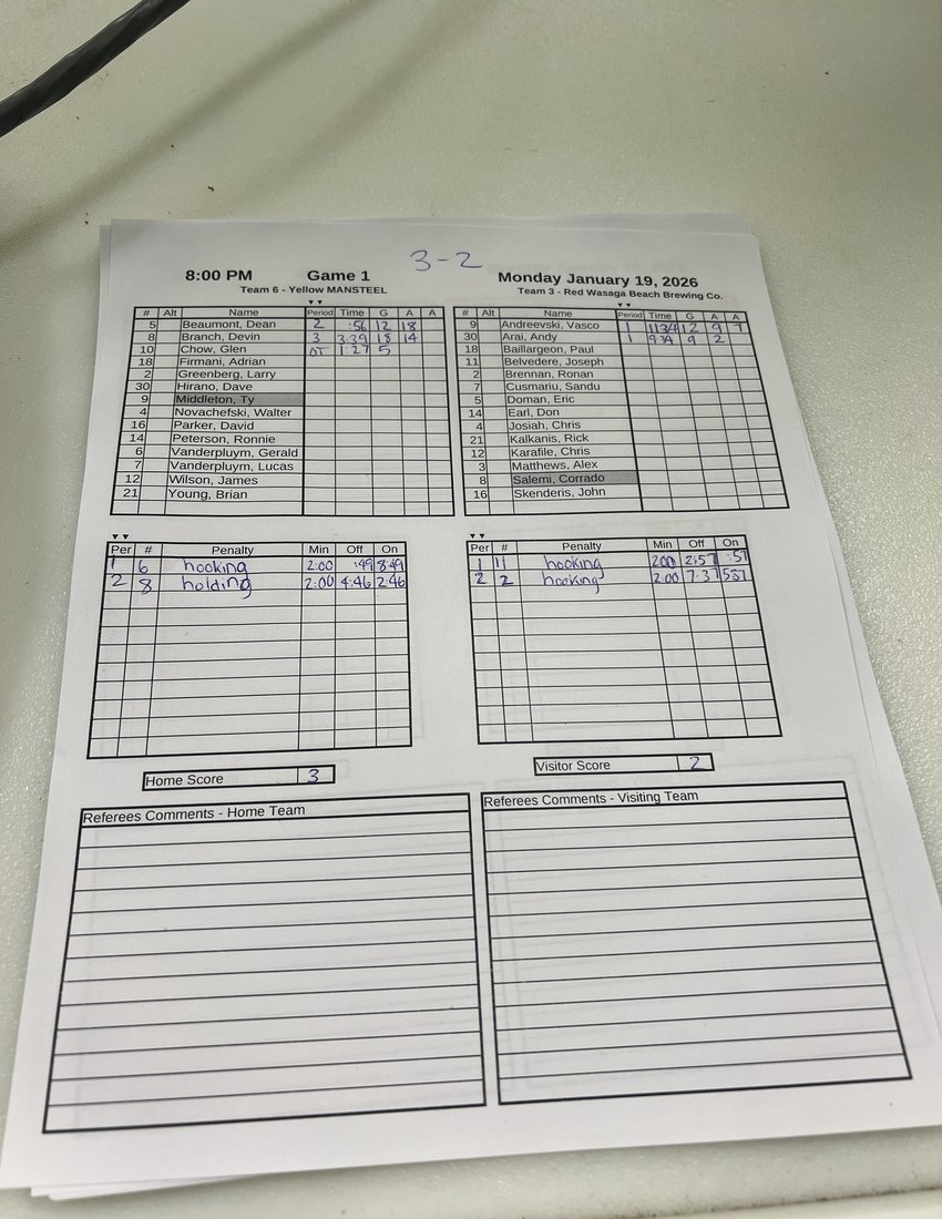 | 109 | 2026-Jan-19 | 1 | 3 Wasaga Beach Brewing Co. | 6 MANSTEEL | 2 - 3 | OT |