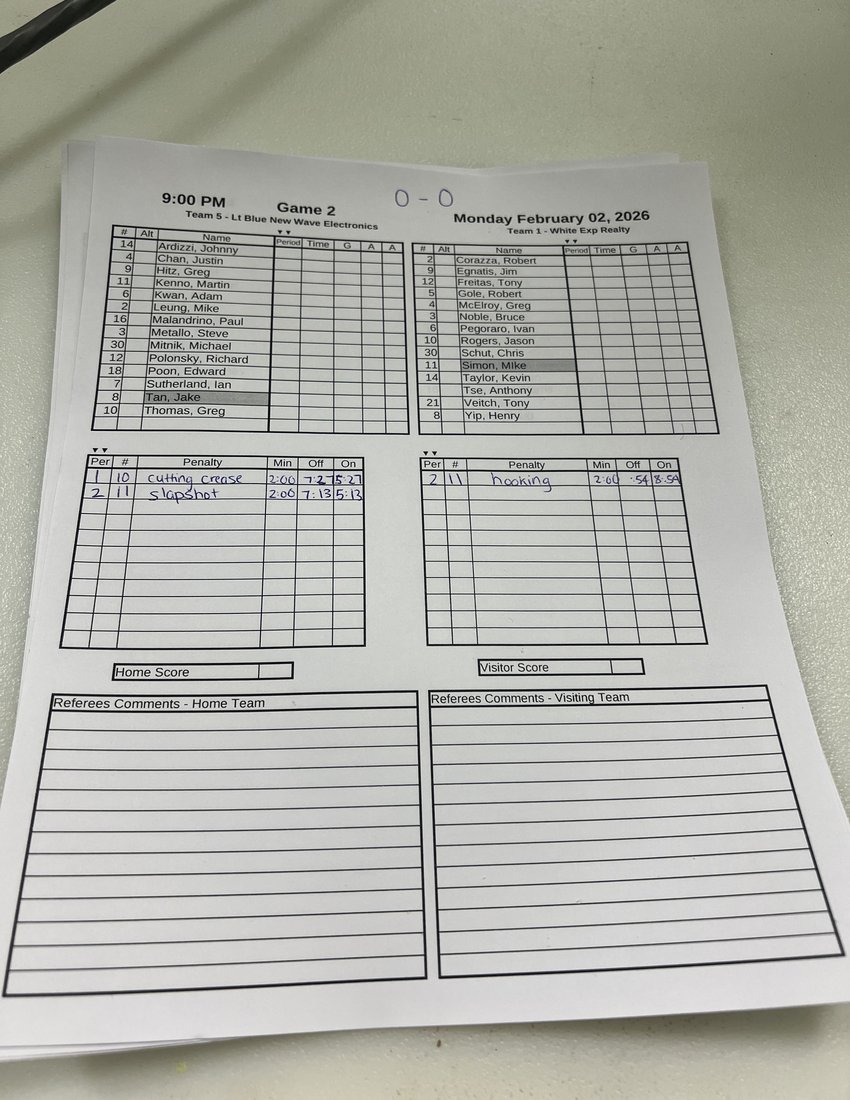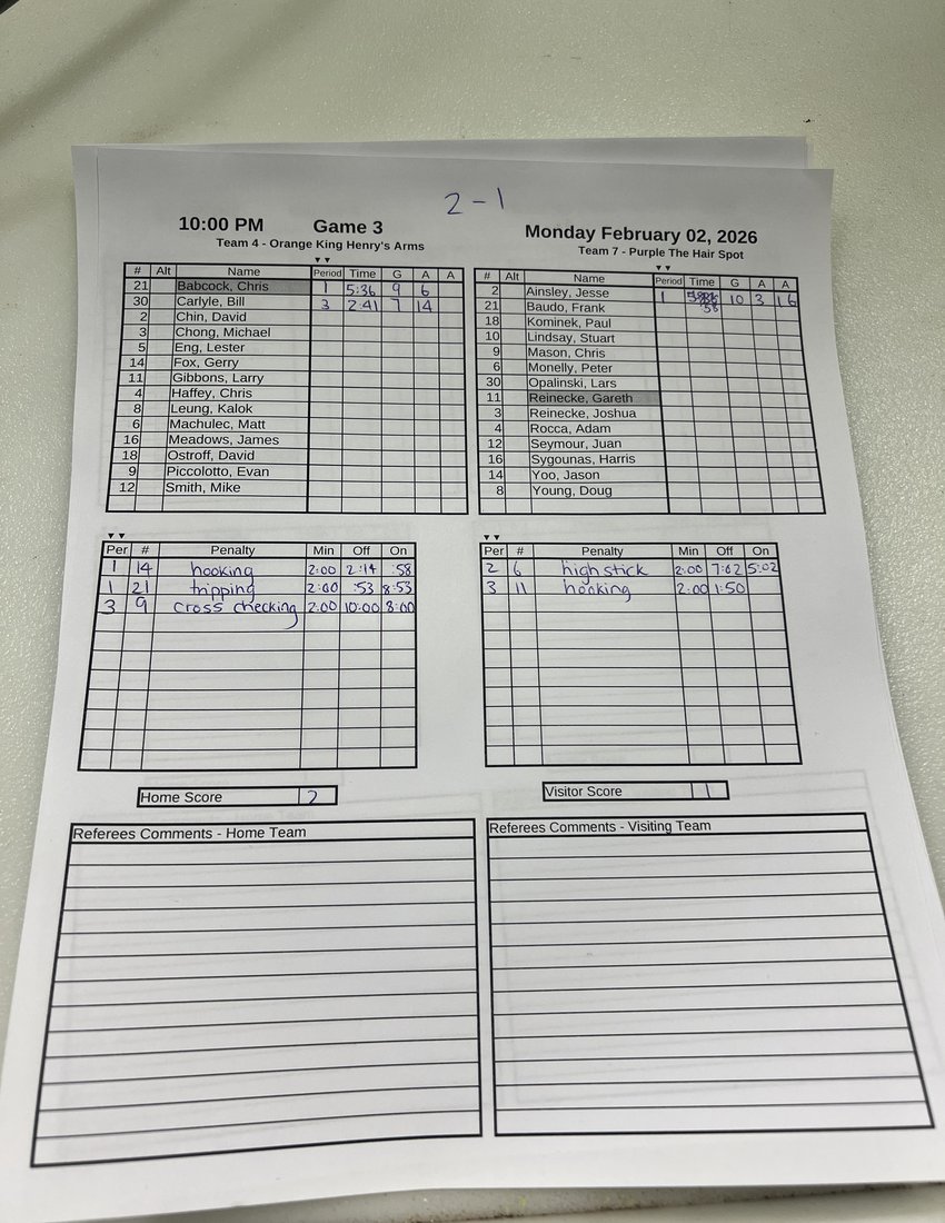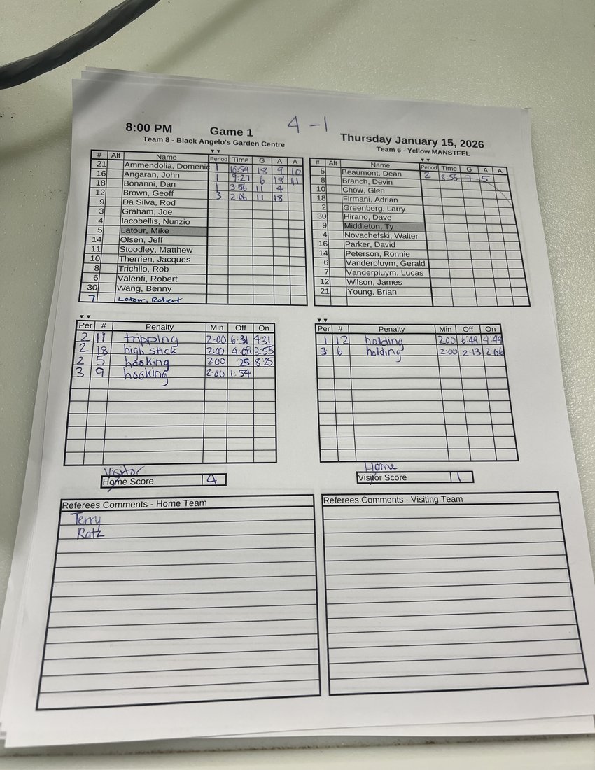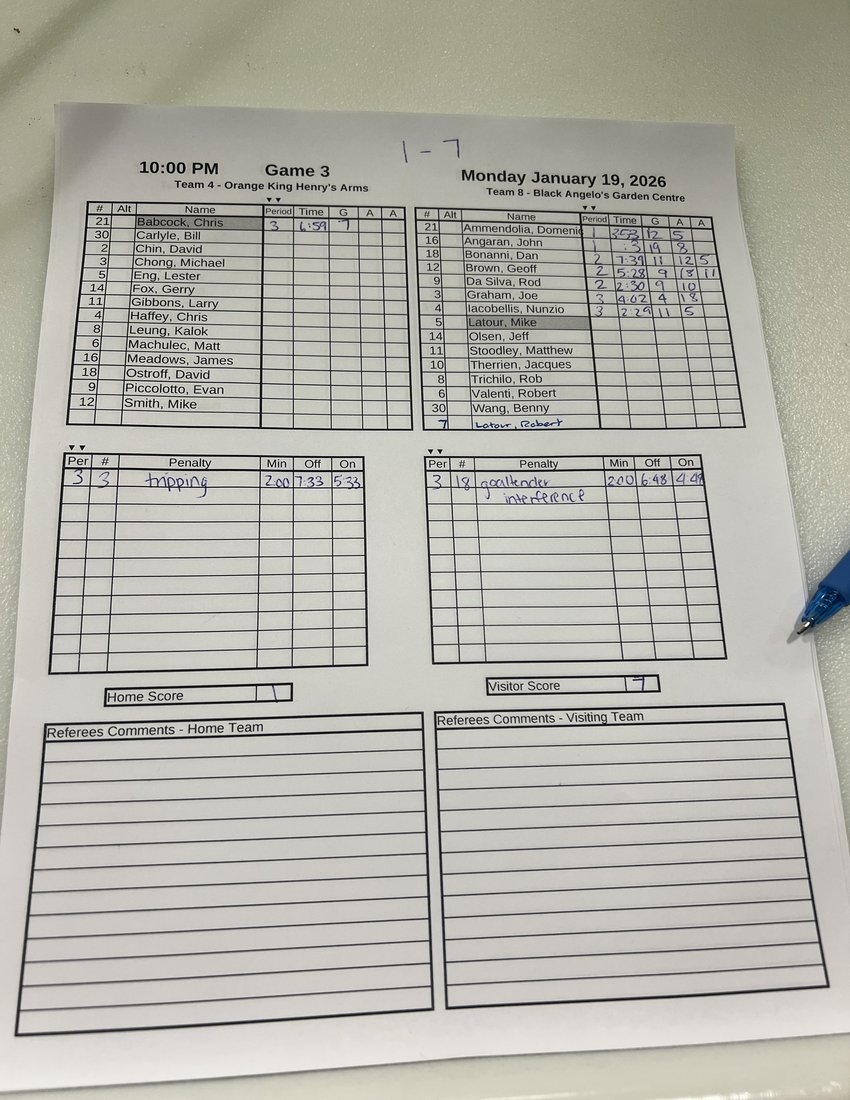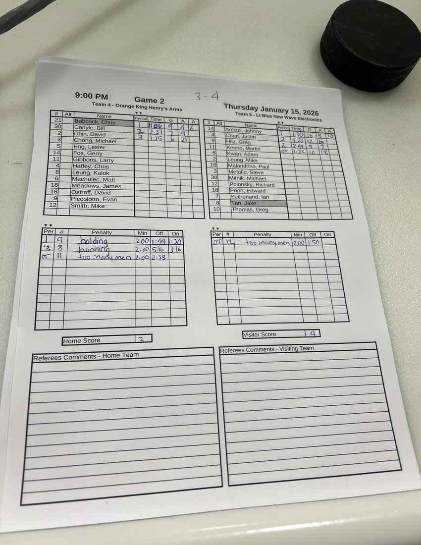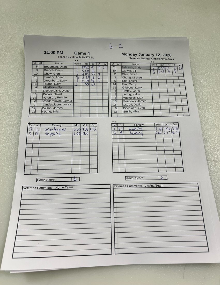 | 109 | 2026-Jan-19 | 1 | 3 Wasaga Beach Brewing Co. | 6 MANSTEEL | 2 - 3 | OT |