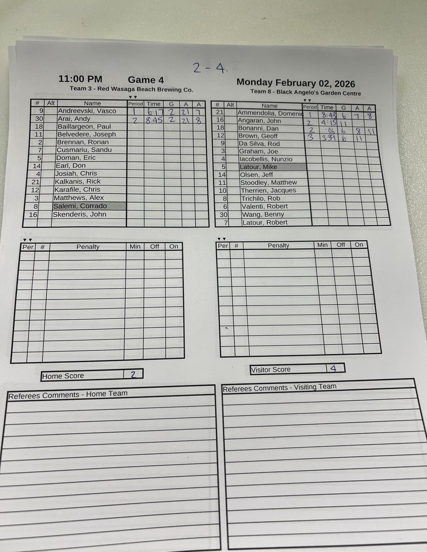 | 124 | 2026-Feb-2 | 4 | 8 Angelo's Garden Centre | 3 Wasaga Beach Brewing Co. | 4 - 2 | |