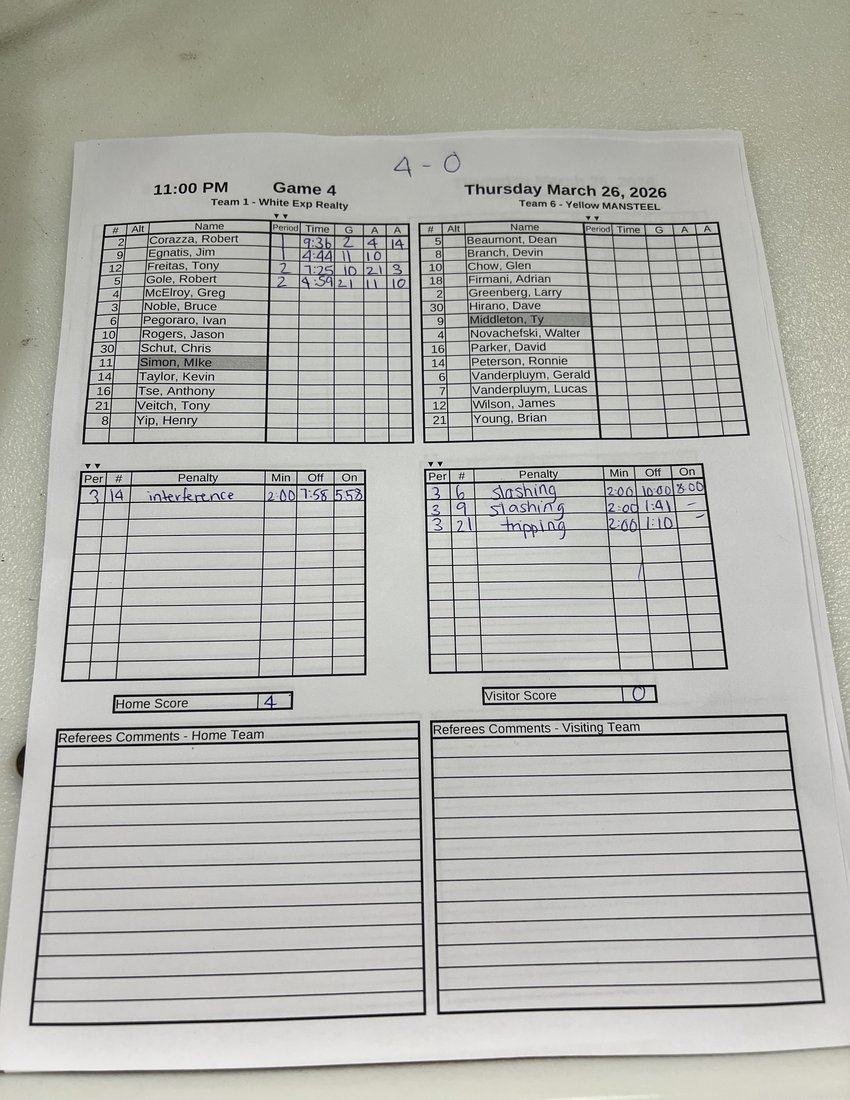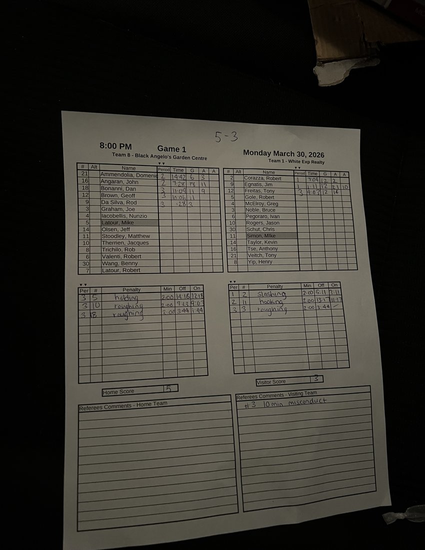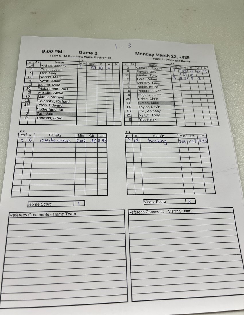 | 9 | 2026-Mar-9 | 1 | 1 Exp Realty | 3 Wasaga Beach Brewing Co. | 2 - 0 | |