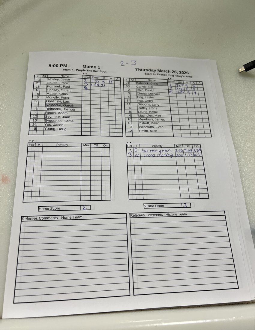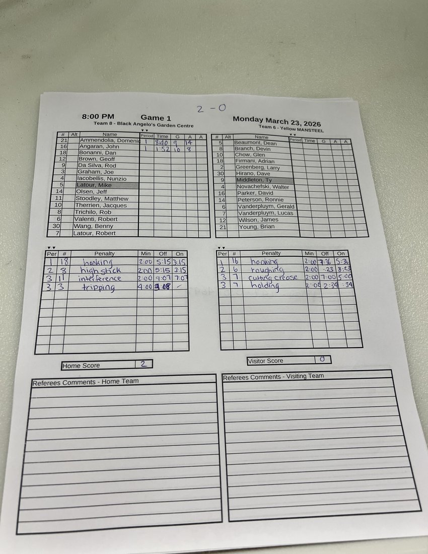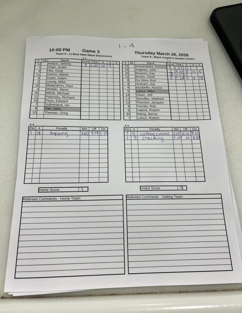 | 20 | 2026-Mar-23 | 4 | 3 Wasaga Beach Brewing Co. | 7 The Hair Spot | 6 - 5 | OT |